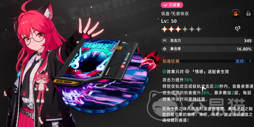 弧盘也就是武器,除了基础的属性外,还有技能效果,娜娜莉的话强烈推荐使用“无首铁驭”,加攻击力白值,加暴击率百分比。而且拥有仅对情感适配者生效的效果“焰魂狂飙”,提升16%攻击力,并且是释放变轨攻击或者极轨攻击后的20秒内,普攻伤害提升20%,能叠2层,并且每一层的持续时间是单独结算的。