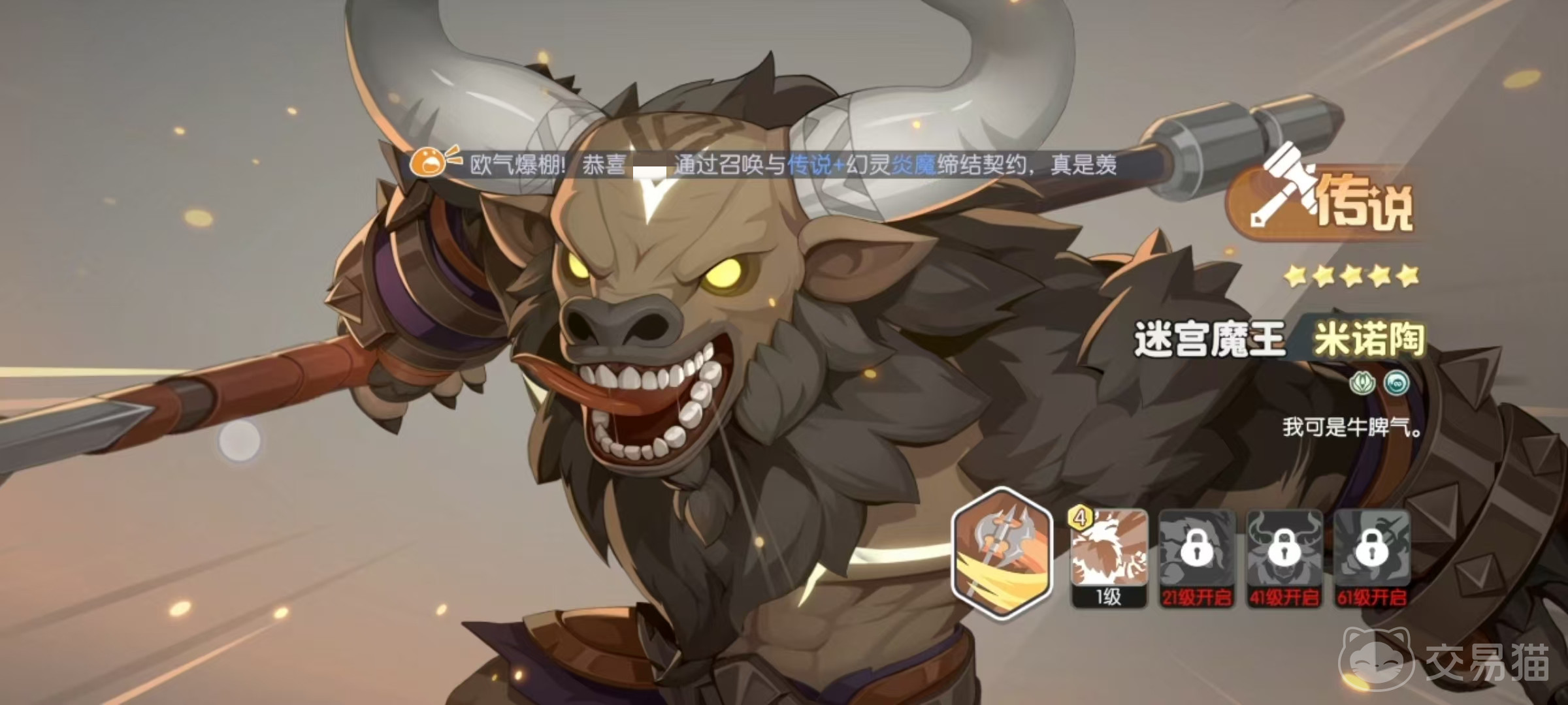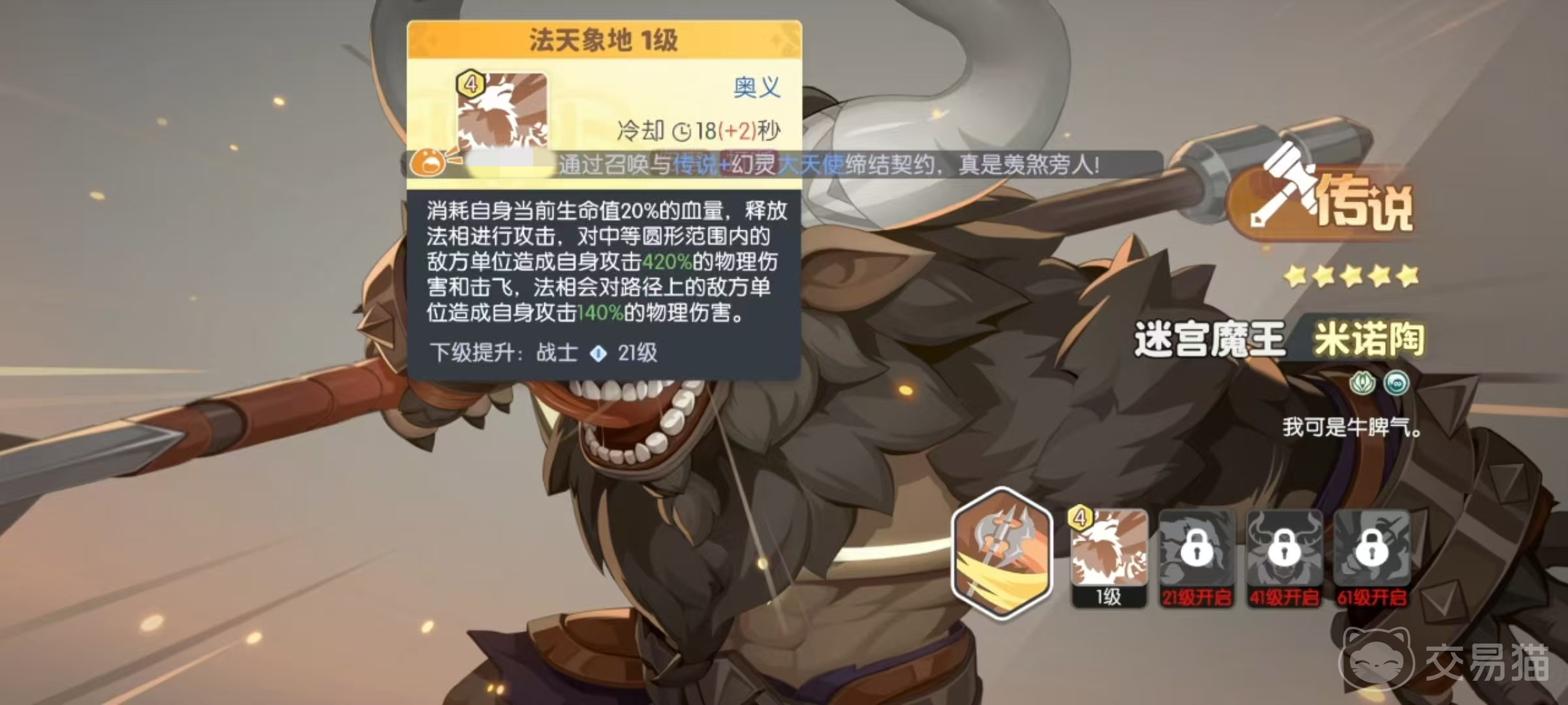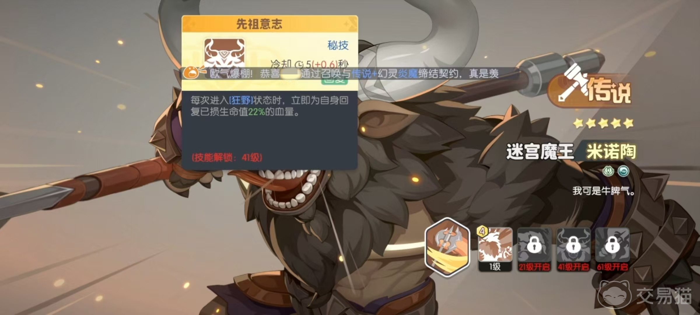 米诺陶的自身天赋是野性旋风,血量降低时会积攒怒气,怒气值满了之后,进入到狂野状态,在此状态下,持续攻击周围敌方单位。另外当我方单位被击败时,米诺陶自身将获得遗言效果,每层遗言可以额外提高旋风的伤害,后续在进行升级时,还有提高攻击力,以及提高自身受到治疗效果的额外附加。